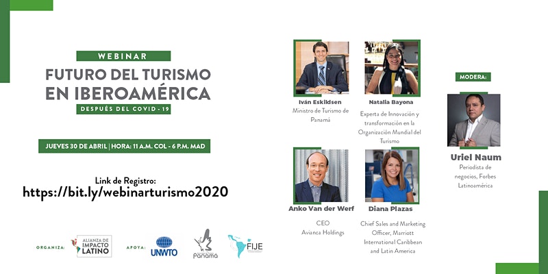 La Alianza de Impacto Latino organiza y promueve el Webinar: Futuro del turismo en Iberoamérica después del COVID-19, durante el cual líderes de la región hablarán sobre el panorama del sector turístico. En este espacio se analizarán los retos y recomendaciones necesarias para restablecer el sector del turismo desde sus diferentes frentes. Para participar realice el registro aquí.