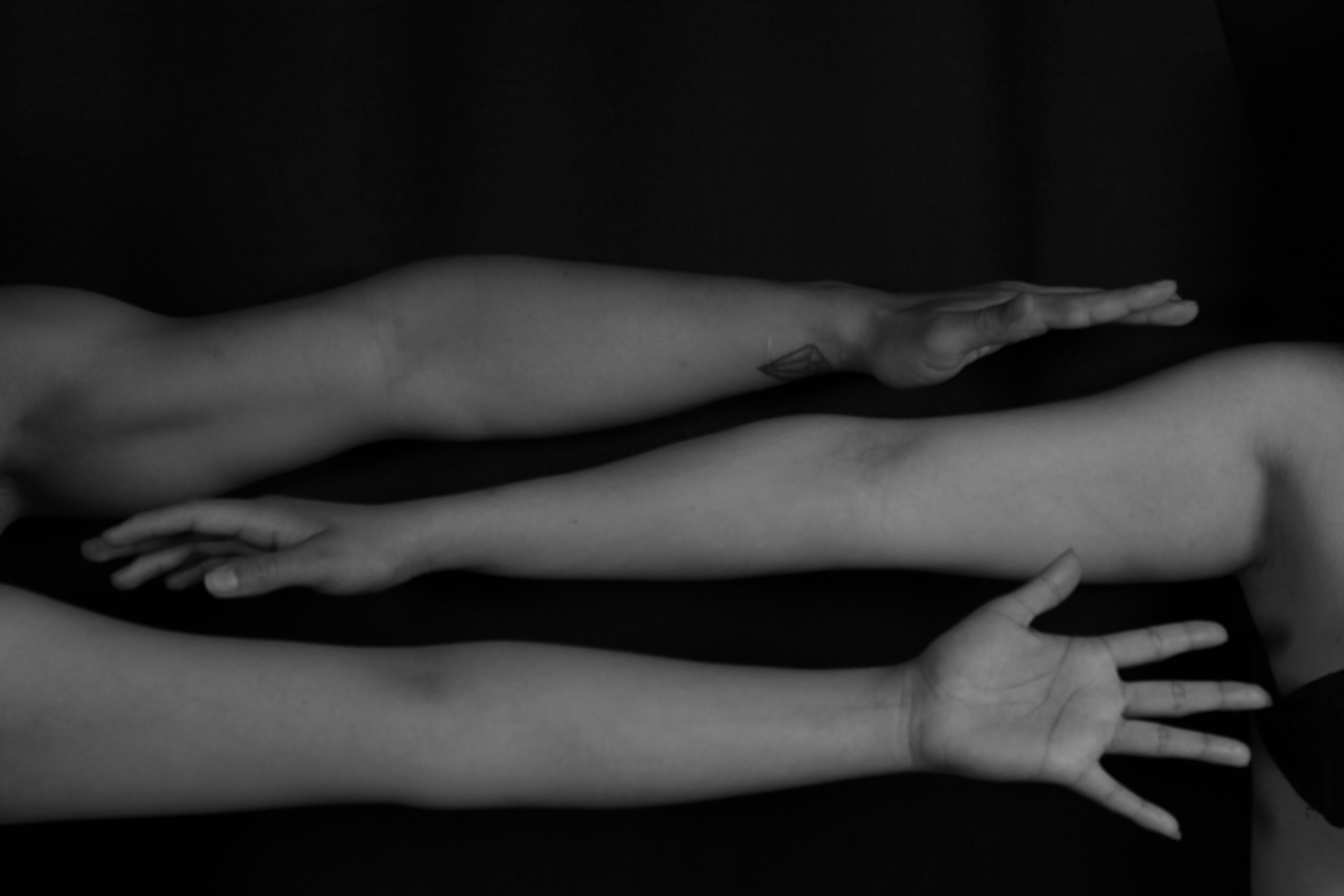 Una vez que me explicó lo anterior, le pregunté por su serie fotográfica llamada Genero, fig 1 y fig 2. Son algunas instantáneas de un fuerte contraste, cortes de cuerpxs yuxtapuestos en un fondo negro, hay una versión en tonos jades y otra en blanco y negro. Algunas son de piernas, otras de brazos, pechos y manos. Yo destaco sólo dos que se muestran al final del escrito. Por inmediatez, relacioné sus piezas con Man and Women del fotógrafo Eikoh Hosoe, en ambos hay una búsqueda por llegar a una suerte de esencia de lo que significa el género. En el caso del artista nipón, hay un sentimiento de erotismo que impregna la obra. En el caso de Melissa, hay hartazgo:
