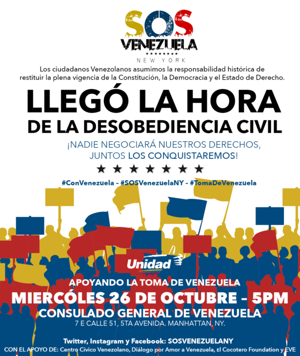 NUEVA YORK (Miércoles 26 de octubre): En solidaridad con los connacionales que realizarán mañana miércoles La Toma de Venezuela una manifestación masiva para protestar contra la suspensión ilegal e inconstitucional del referéndum revocatorio, los venezolanos quienes viven en el área triestatal de Nueva York, Nueva Jersey y Connecticut, están invitados a participar en una concentración pacífica que se desarrollará frente al Consulado General de Venezuela en Nueva York este miércoles a las 5:00pm.