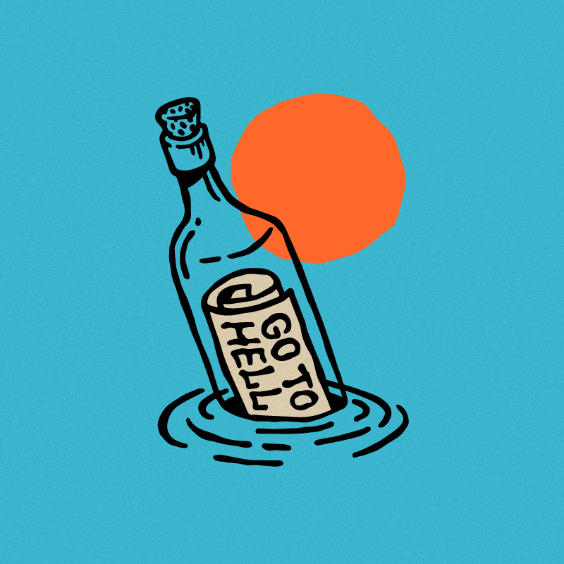 Vi lo que haces en tu página web y entre tus diseños para compañías, posters, flyers y banners, me quedé con esa ilustración del mensaje en la botella. Lanzar una botella al mar con un mensaje tan poco amigable, ¿no te parece pesimista?