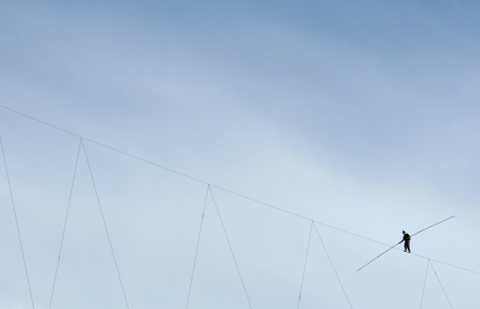 Diviso una cuerda floja agarrada en dos puntos del infinito: soy un equilibrista que pierde el ritmo, y que está a punto de caer. No hay red. Solo tengo un balcón en el vacío y el aire limpio de la noche.